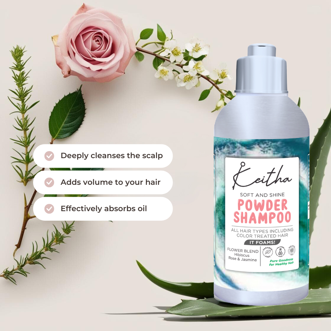 Embrace the harmony of floral nourishment and eco-conscious innovation with Keitha Soft & Shine Powder Shampoo. This water-free, foaming shampoo transforms your hair care routine into a luxurious, sustainable ritual.