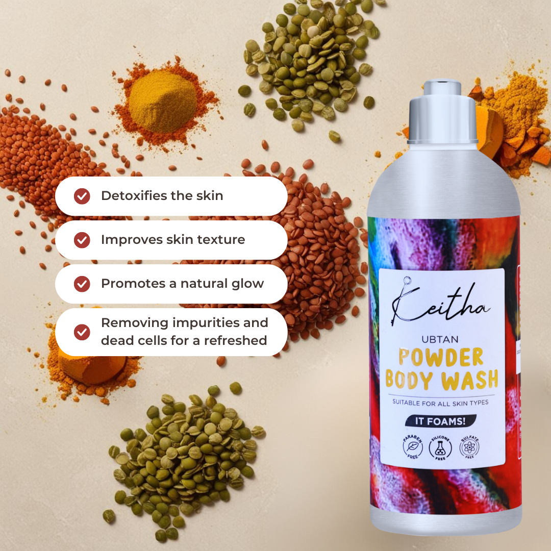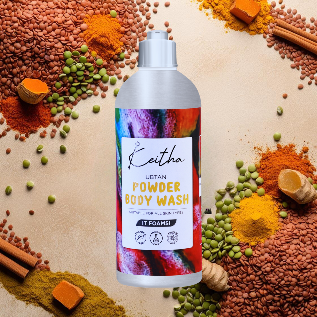Experience the age-old skincare ritual reimagined with Keitha Ubtan Powder Body Wash, a modern twist on a timeless Indian beauty secret. Crafted with natural lentils, herbs, and clays, this foaming body wash deeply cleanses and rejuvenates your skin, unveiling a fresh, radiant glow.